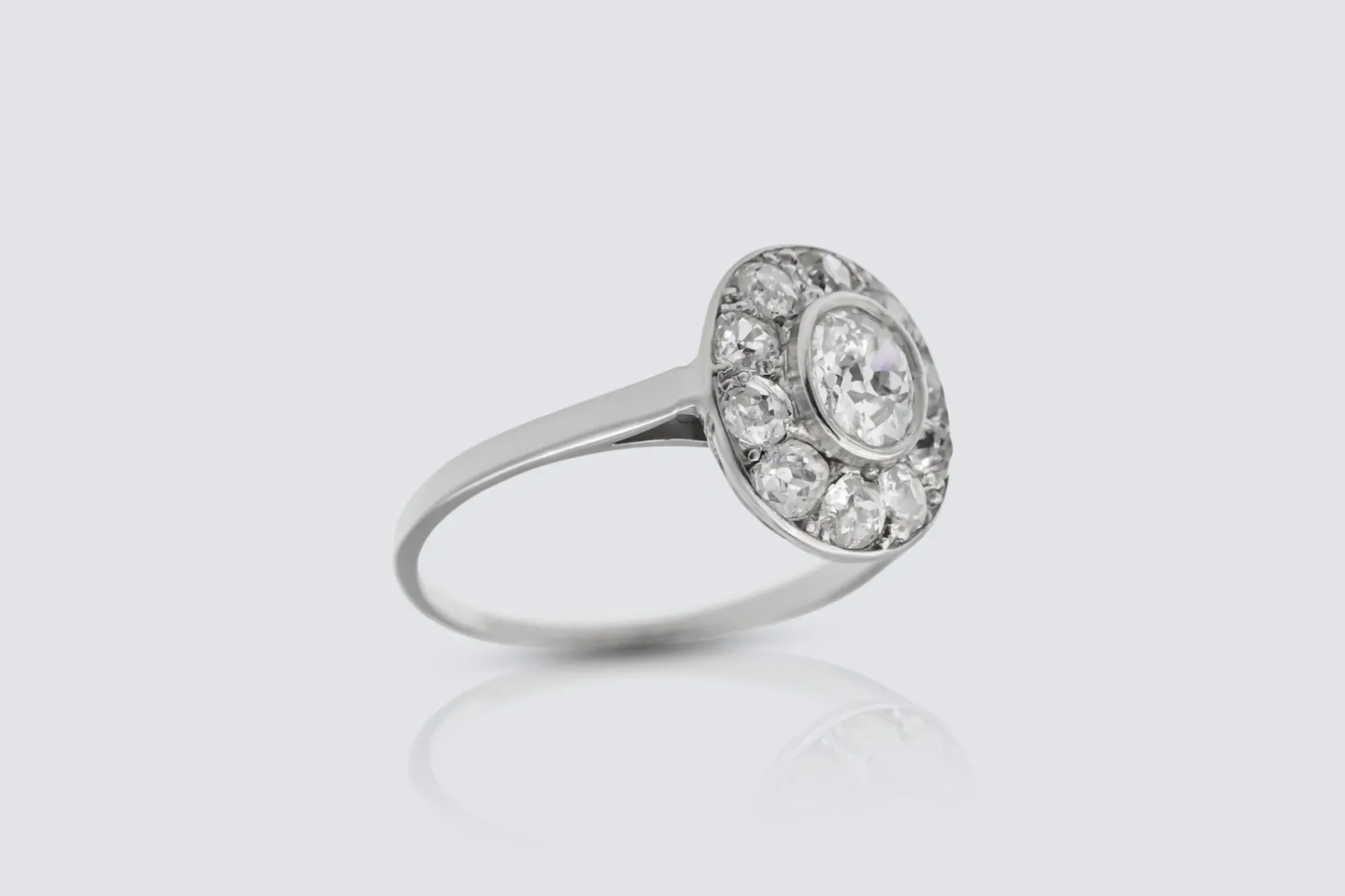 The mix of shapes and old mine facets gives the ring depth, individuality, and a romantic antique feel, while the platinum band adds strength and timeless elegance. Perfect for vintage lovers or those seeking a ring with character, this piece reflects the artistry and refined craftsmanship at the heart of AMPM Luxury Goods.