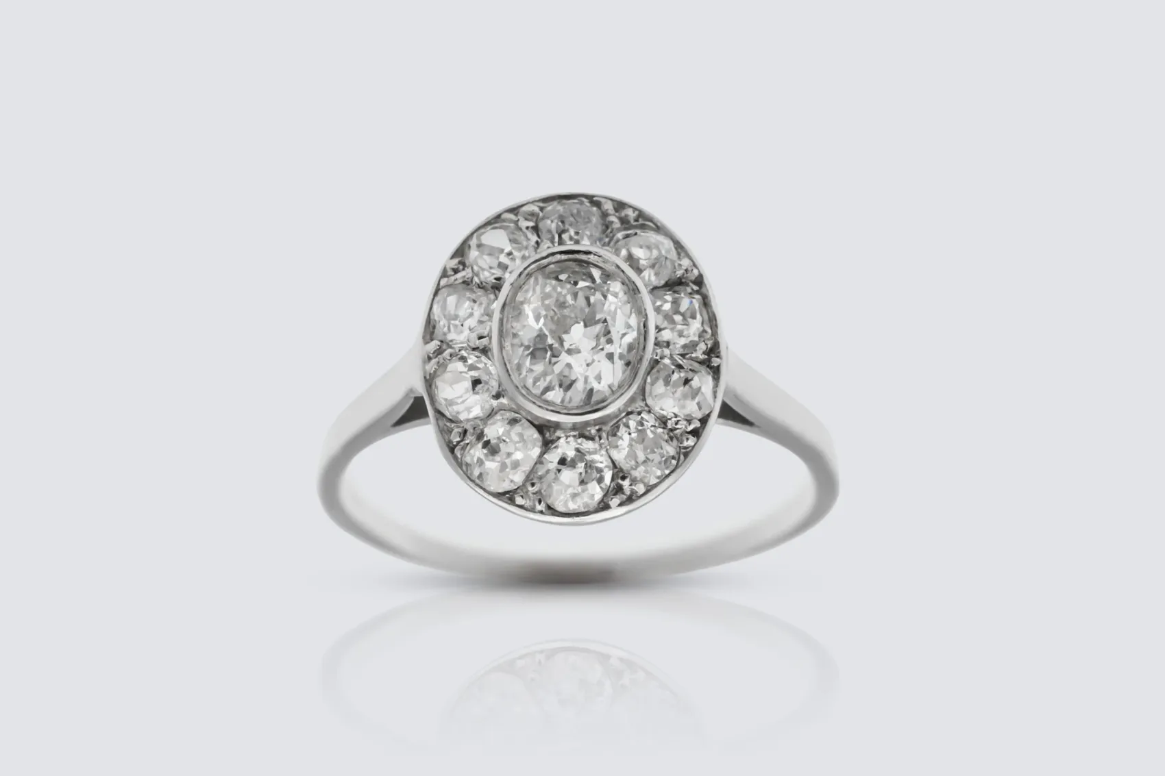 A beautifully refined tribute to antique craftsmanship, this vintage diamond engagement ring features a combination of oval and round natural diamonds, including characterful old mine cut stones, all totalling 1.00ct. Each diamond, graded H to I colour, is set in smooth rubover settings crafted from polished platinum, enhancing the soft glow and unique charm of the vintage cuts.