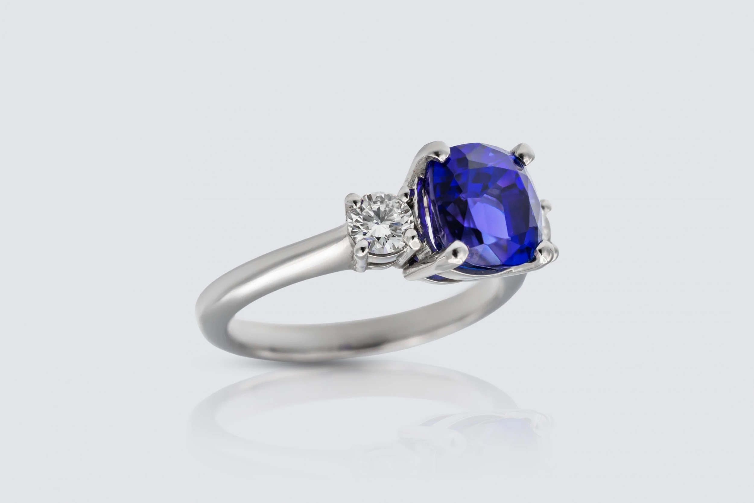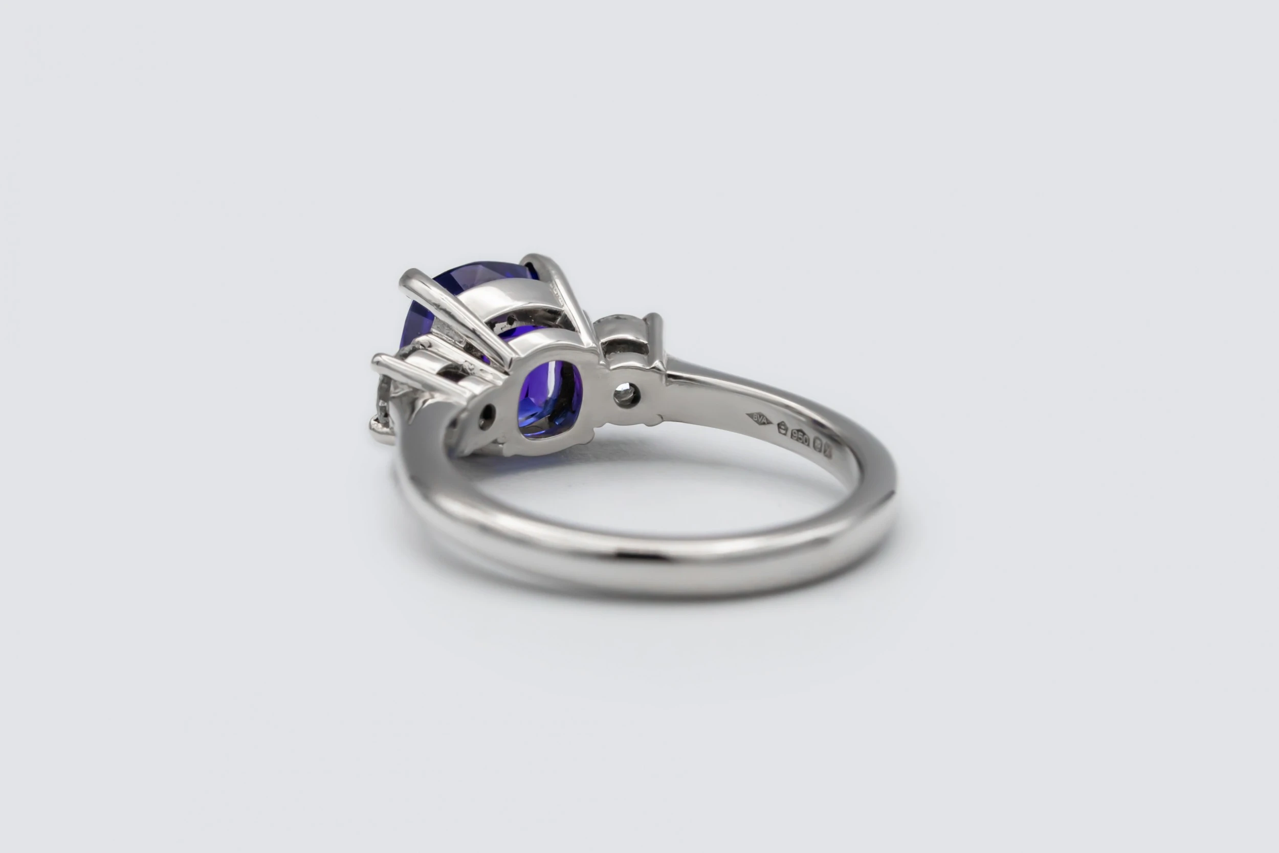 A vibrant and luxurious design, this tanzanite and diamond ring features a captivating 2.82ct natural oval tanzanite paired with 0.48ct of natural brilliant round diamonds, all expertly prong set in polished platinum. The tanzanite displays a rich blue violet hue with exceptional depth, while the diamonds add refined sparkle and contrast, enhancing the beauty of the centre stone.