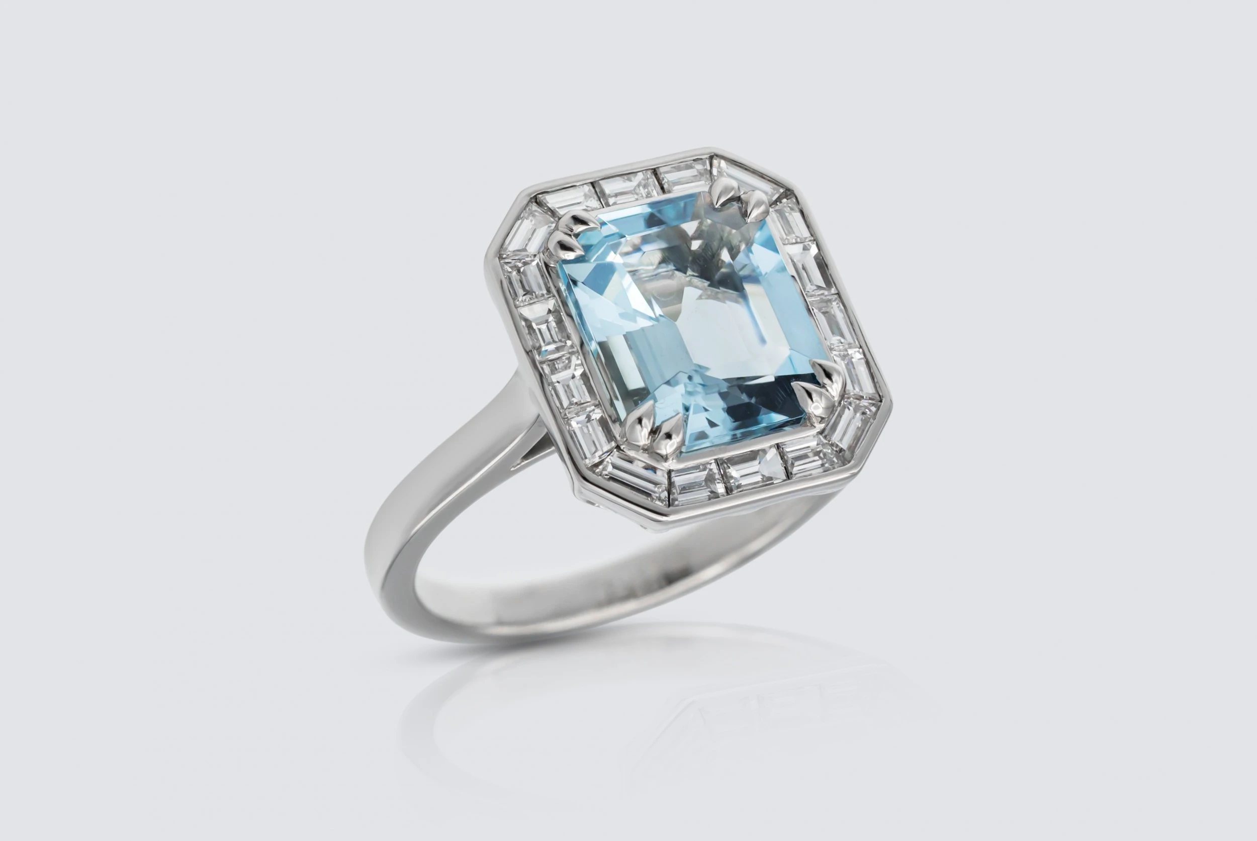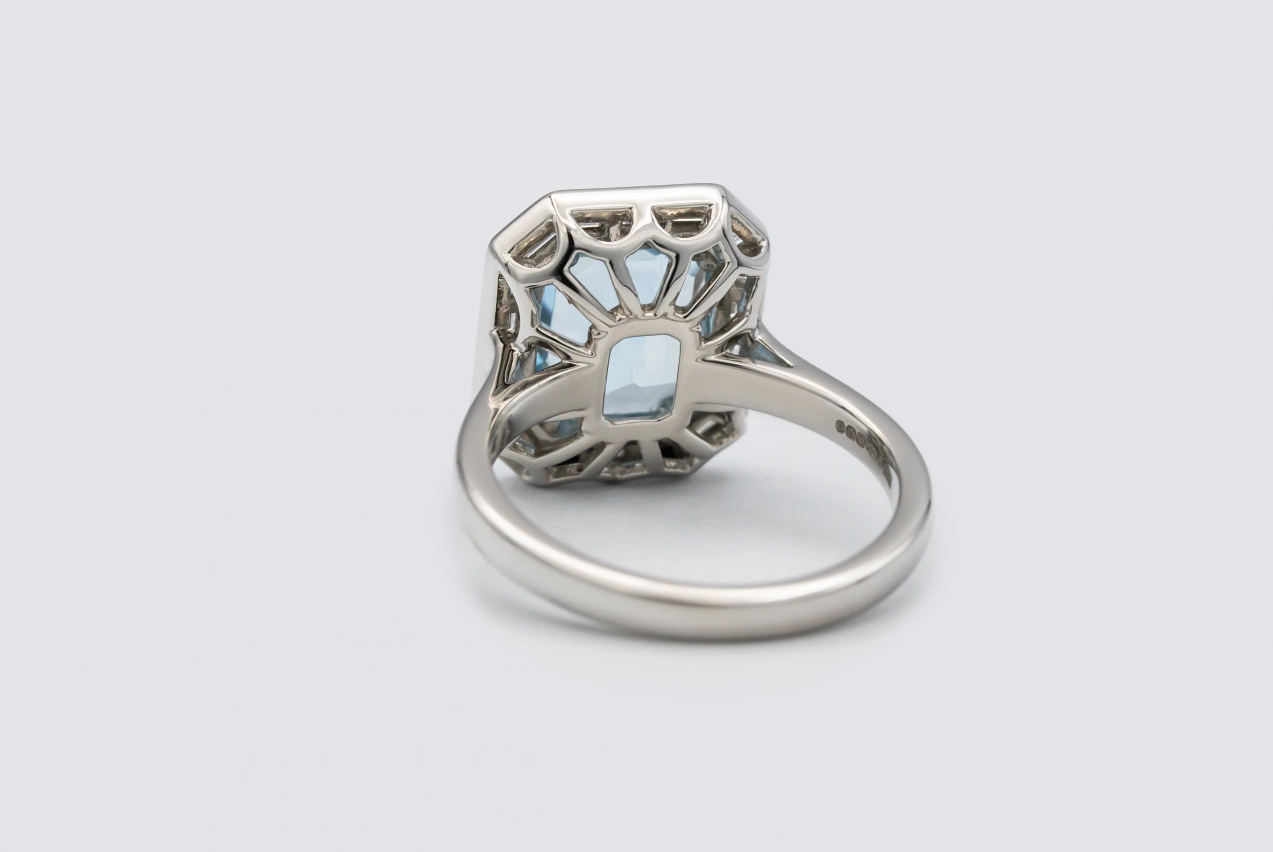 A striking and sophisticated design, this aquamarine and diamond halo ring showcases a breathtaking 2.53ct natural emerald cut aquamarine, perfectly framed by 0.73ct of natural brilliant round diamonds. Expertly double claw set in polished platinum, the aquamarine displays a cool, luminous blue hue enhanced by the crisp sparkle of the surrounding diamonds.
