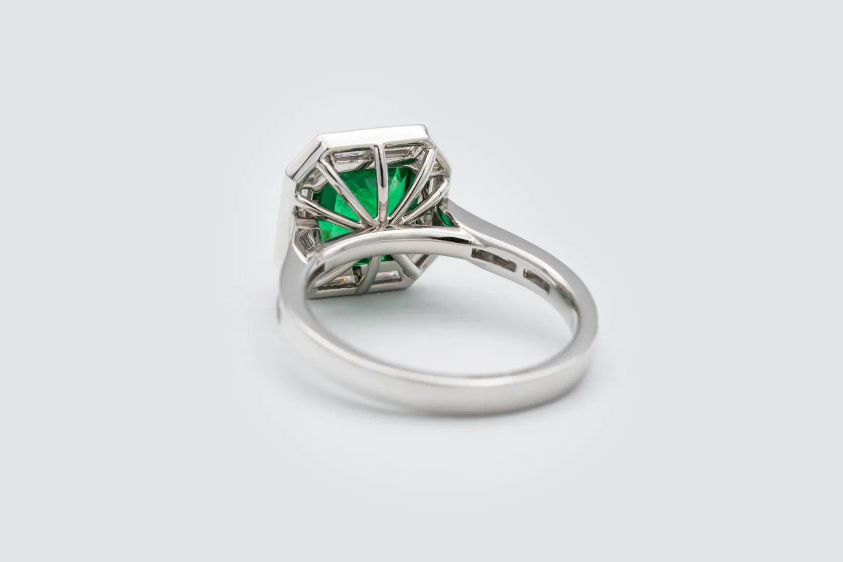 The combination of cushion cut emerald and baguette diamonds offers both classic charm and contemporary sophistication, resulting in a luxurious statement piece perfect for special occasions or elegant everyday wear. Meticulously crafted with attention to detail, this design reflects the refined artistry and modern luxury that define AMPM Luxury Goods.
