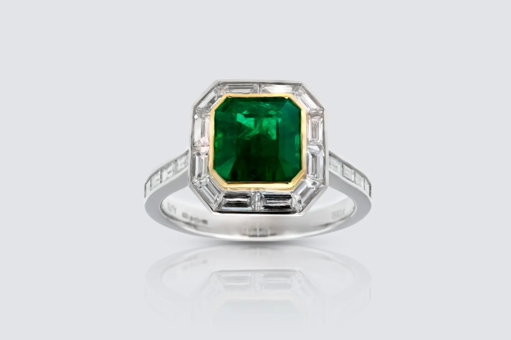 A striking fusion of colour, contrast, and craftsmanship, this emerald and diamond ring features a vivid natural cushion cut emerald, beautifully framed by a refined baguette diamond halo. The emerald is set in warm 18ct yellow gold, creating a rich contrast against the cool brilliance of the platinum band. Each gemstone is delicately rubover set, giving the ring a smooth, modern profile with exceptional durability and elegance.