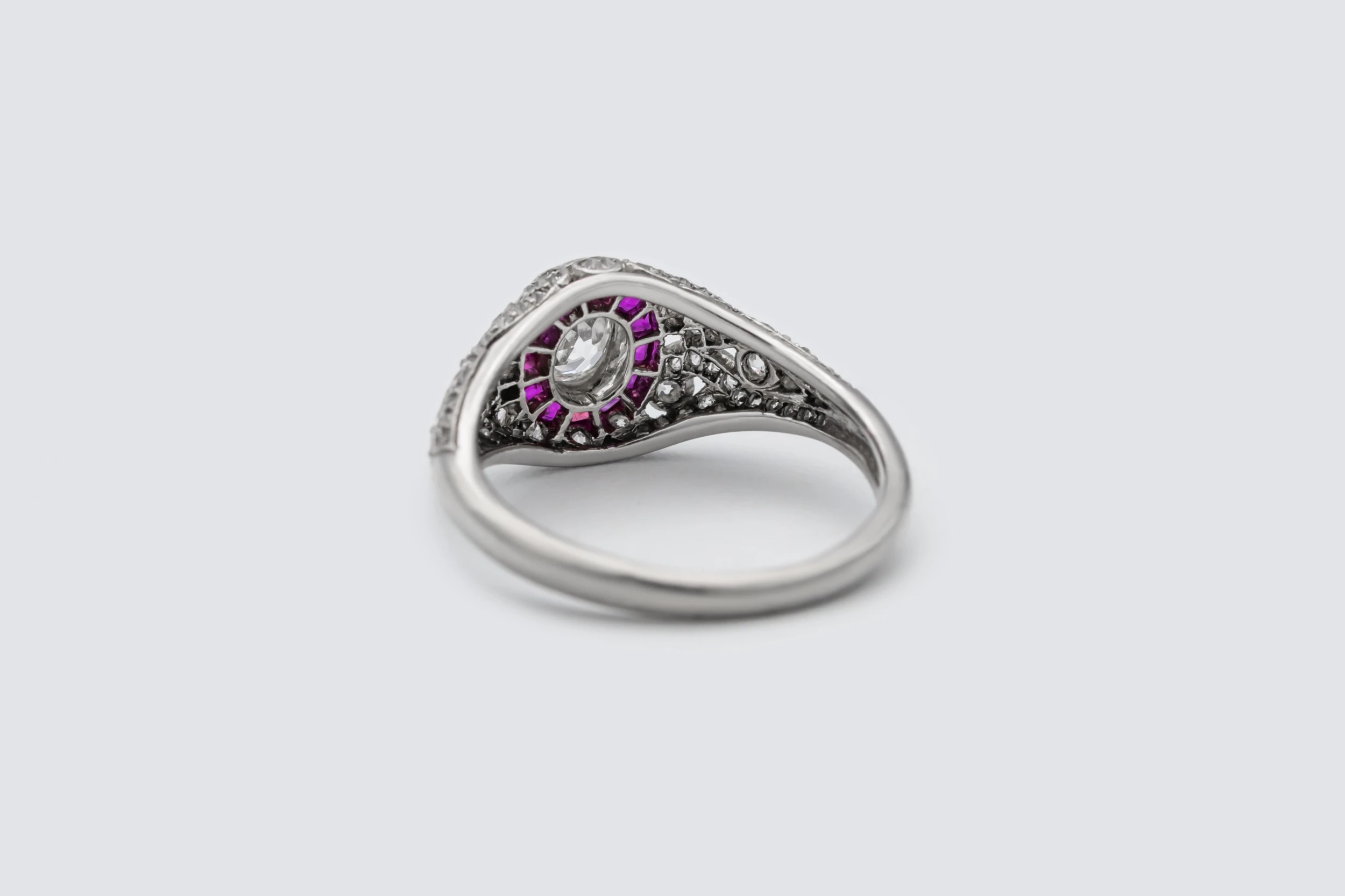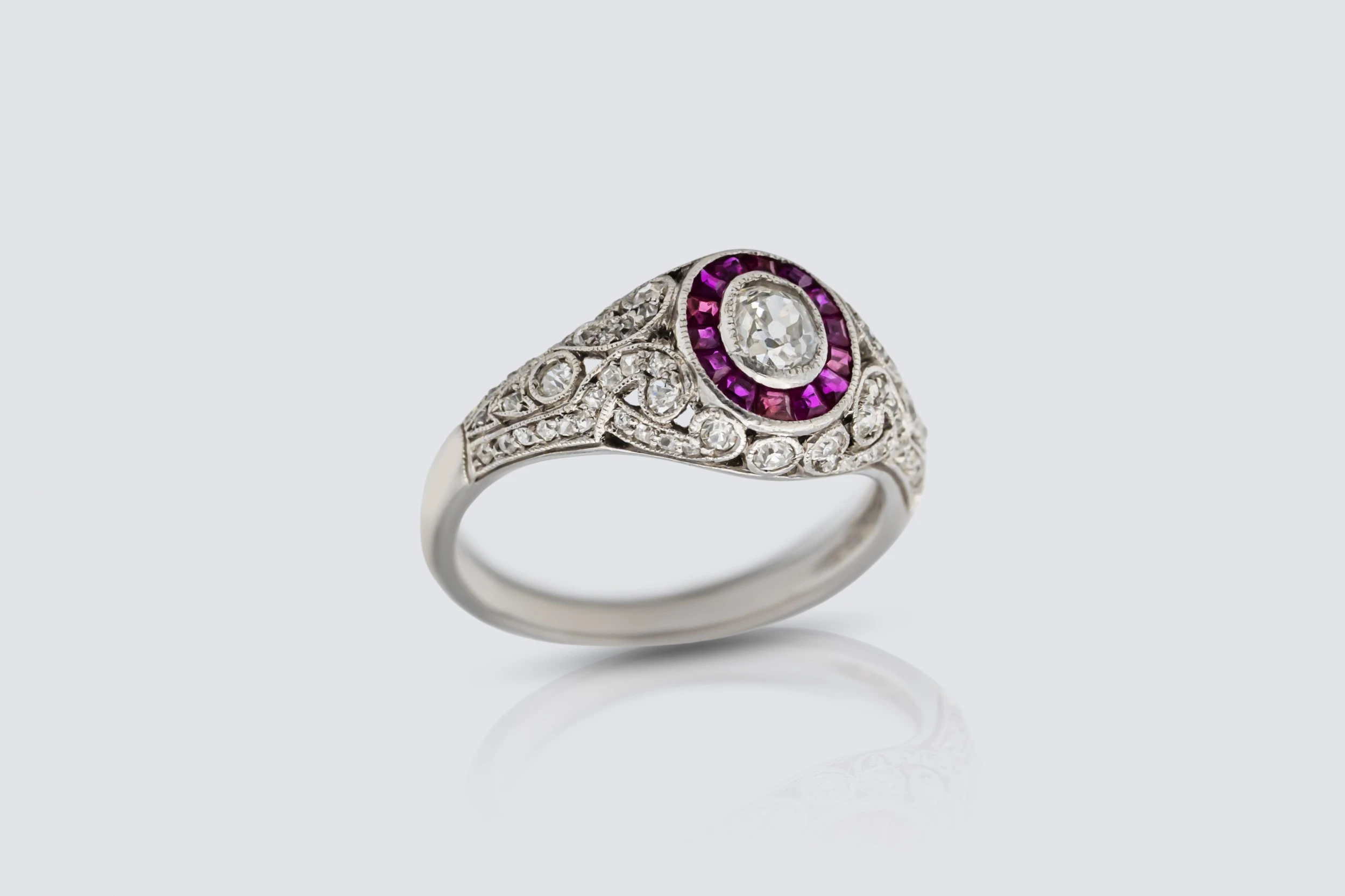 A timeless celebration of vintage charm, this ruby and diamond ring combines old-world craftsmanship with refined modern appeal. Set in luxurious platinum, the design features old mine cut natural diamonds and princess cut natural rubies, beautifully grain set to create depth, texture, and captivating sparkle.