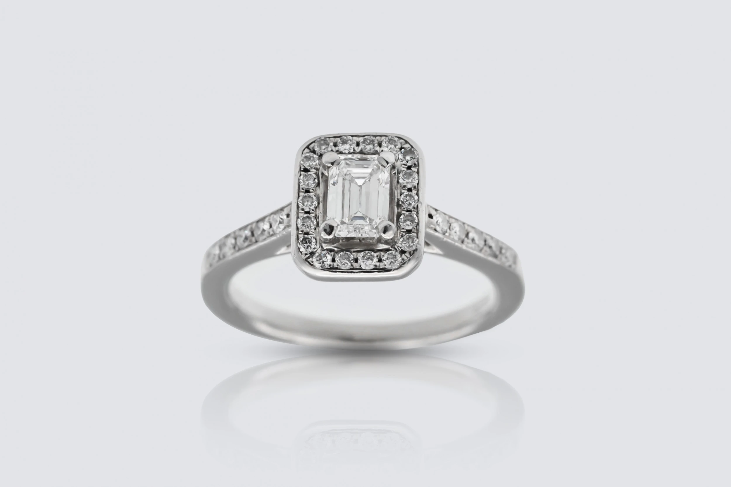 Platinum 0.58ct Emerald Cut Diamond Halo Ring Size K