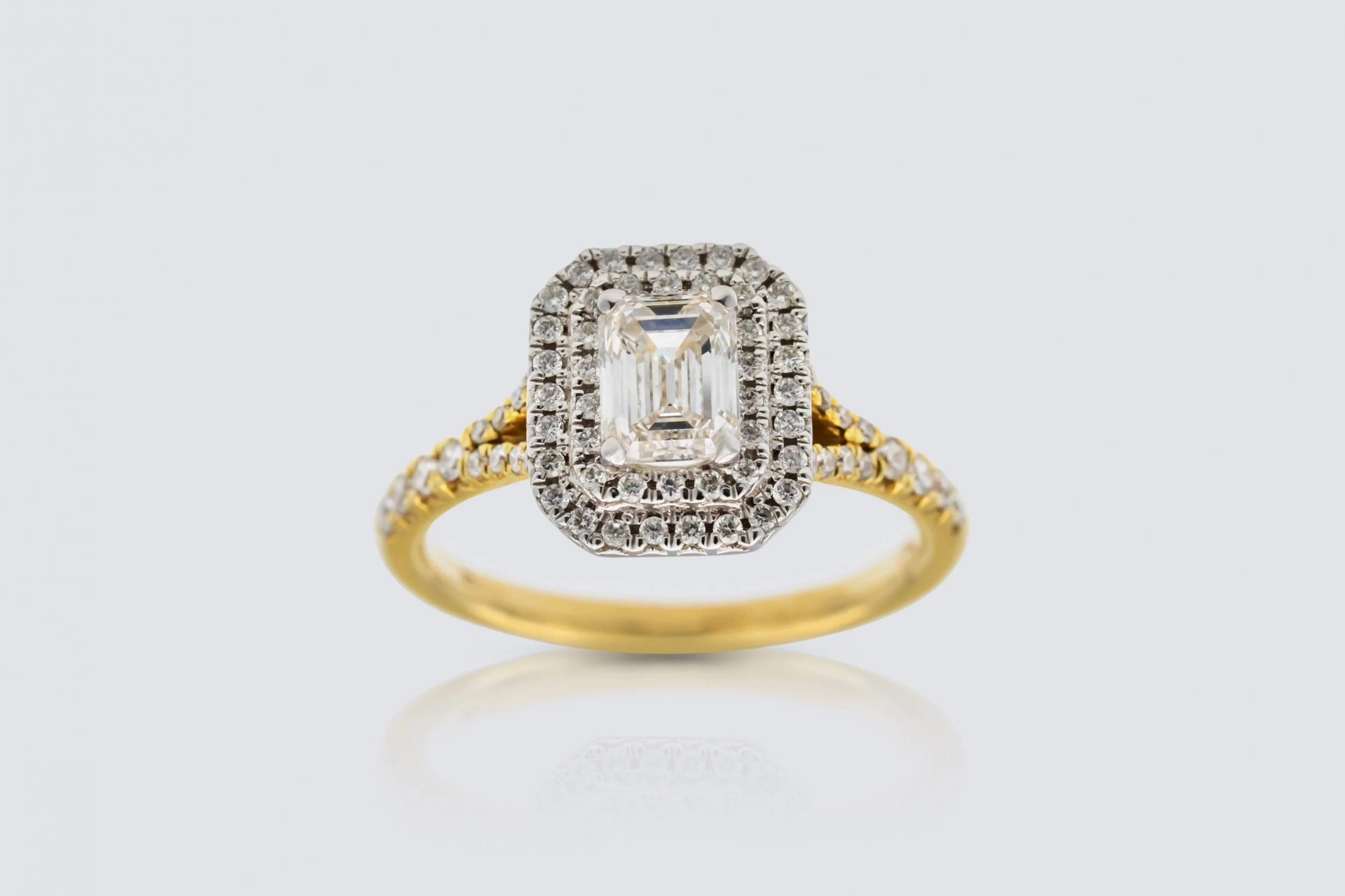 18ct Yellow Gold 0.85ct Emerald Cut Diamond and 0.36ct Brilliant Cut Halo Engagement Ring Size M