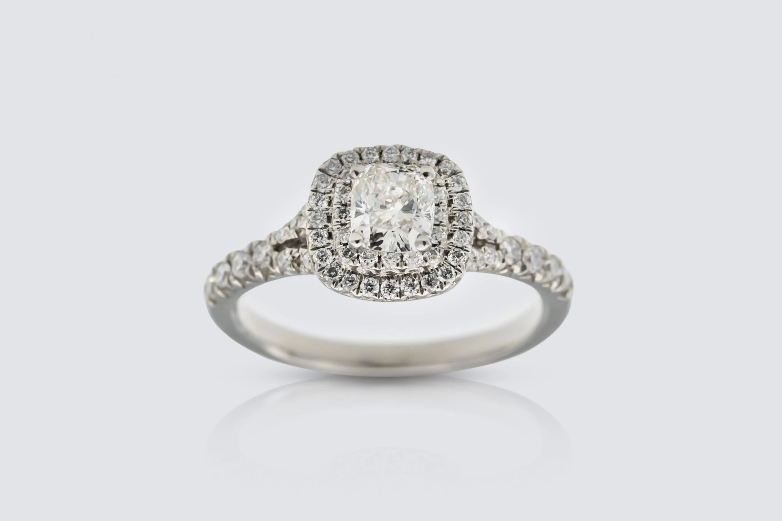 Platinum 0.60ct Cushion Cut Diamond Engagement Ring with 0.20ct Shoulder and Halo Diamonds Size M