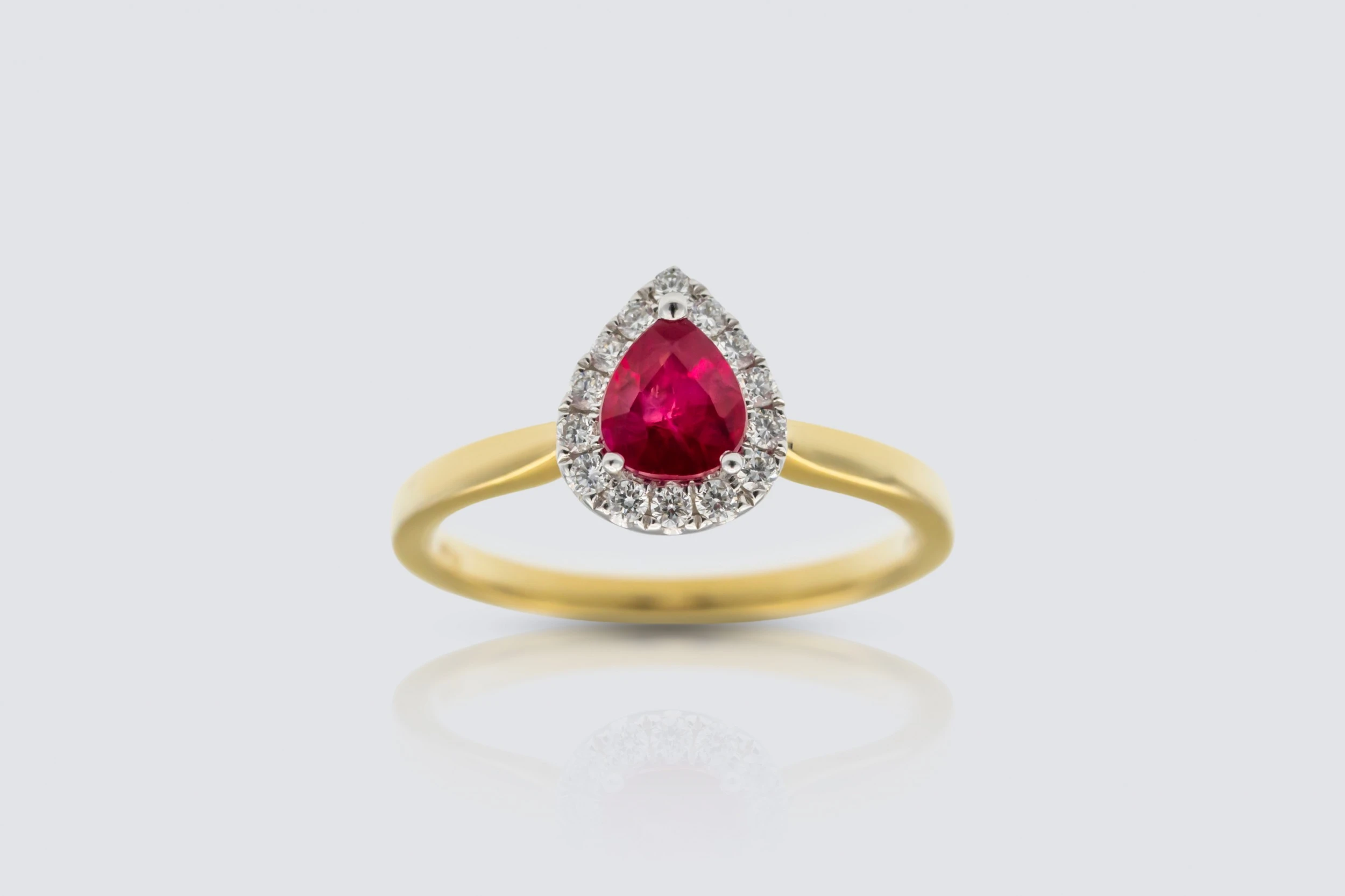 18ct Yellow Gold 0.70ct Ruby and 0.17ct Diamond Pear Shaped Ring Size N