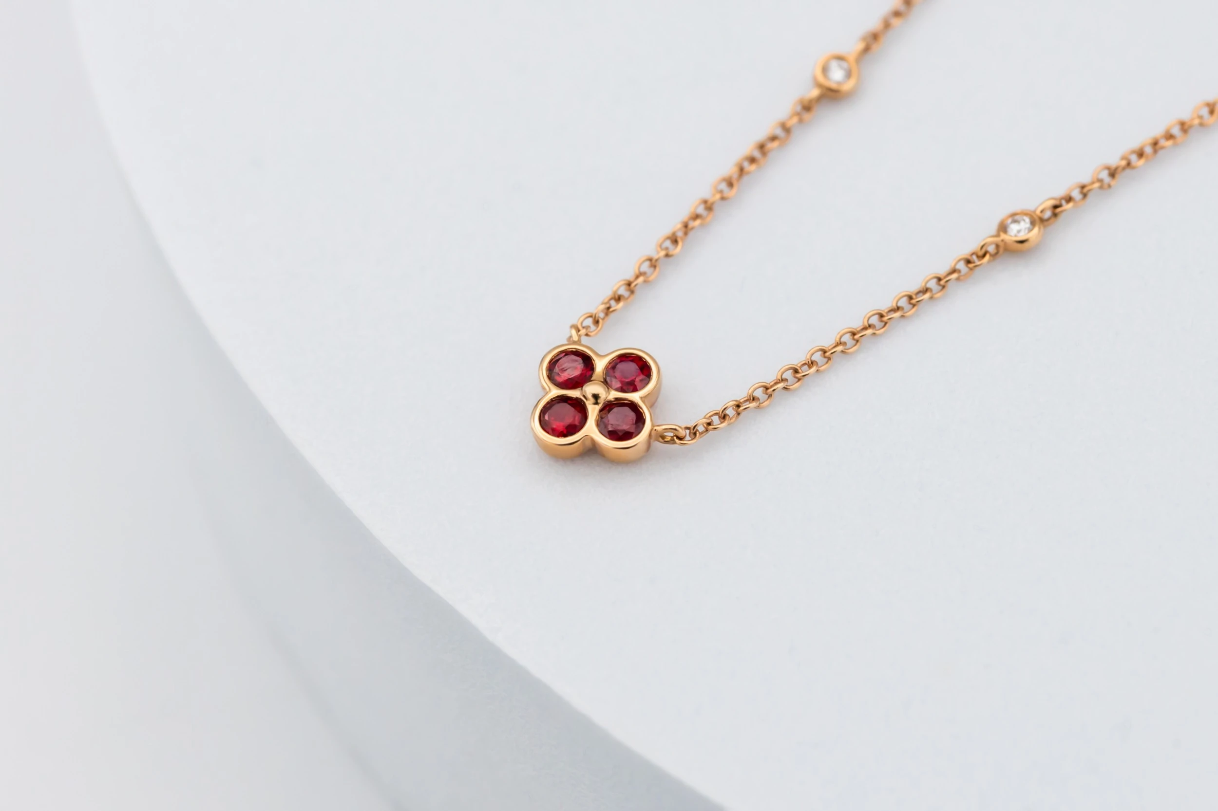 18ct Rose Gold Ruby and Diamond Clover Necklace