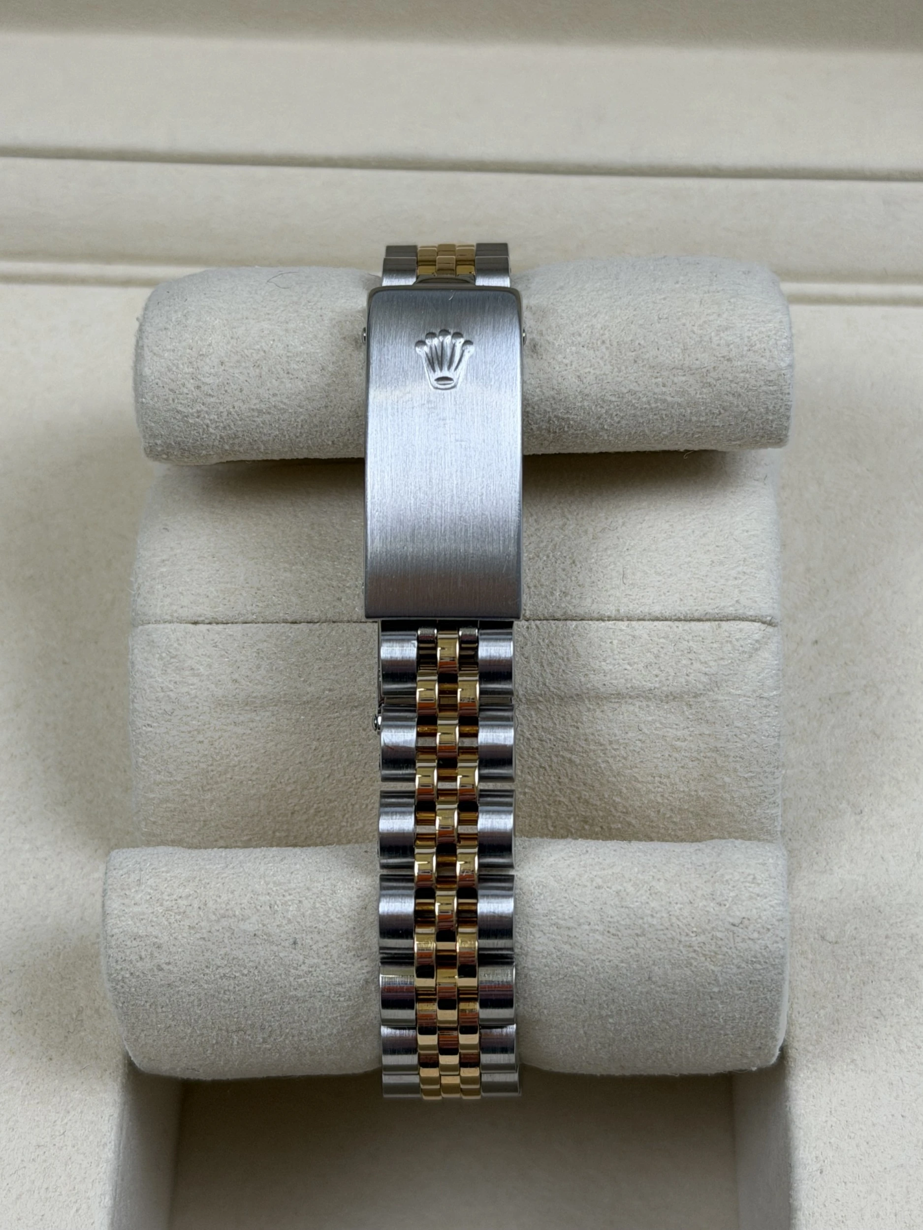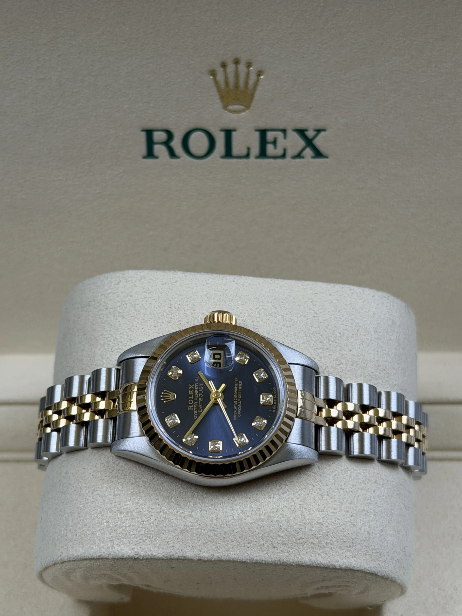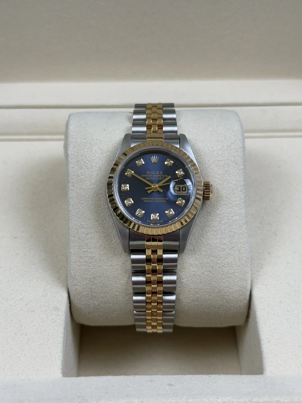 The 69173 remains one of the most admired classic ladies’ Datejust references, appreciated for its timeless two-tone design, elegant proportions and versatile styling. The blue diamond dial adds a luxurious touch, enhancing the model’s desirability among collectors and those seeking a refined everyday Rolex.