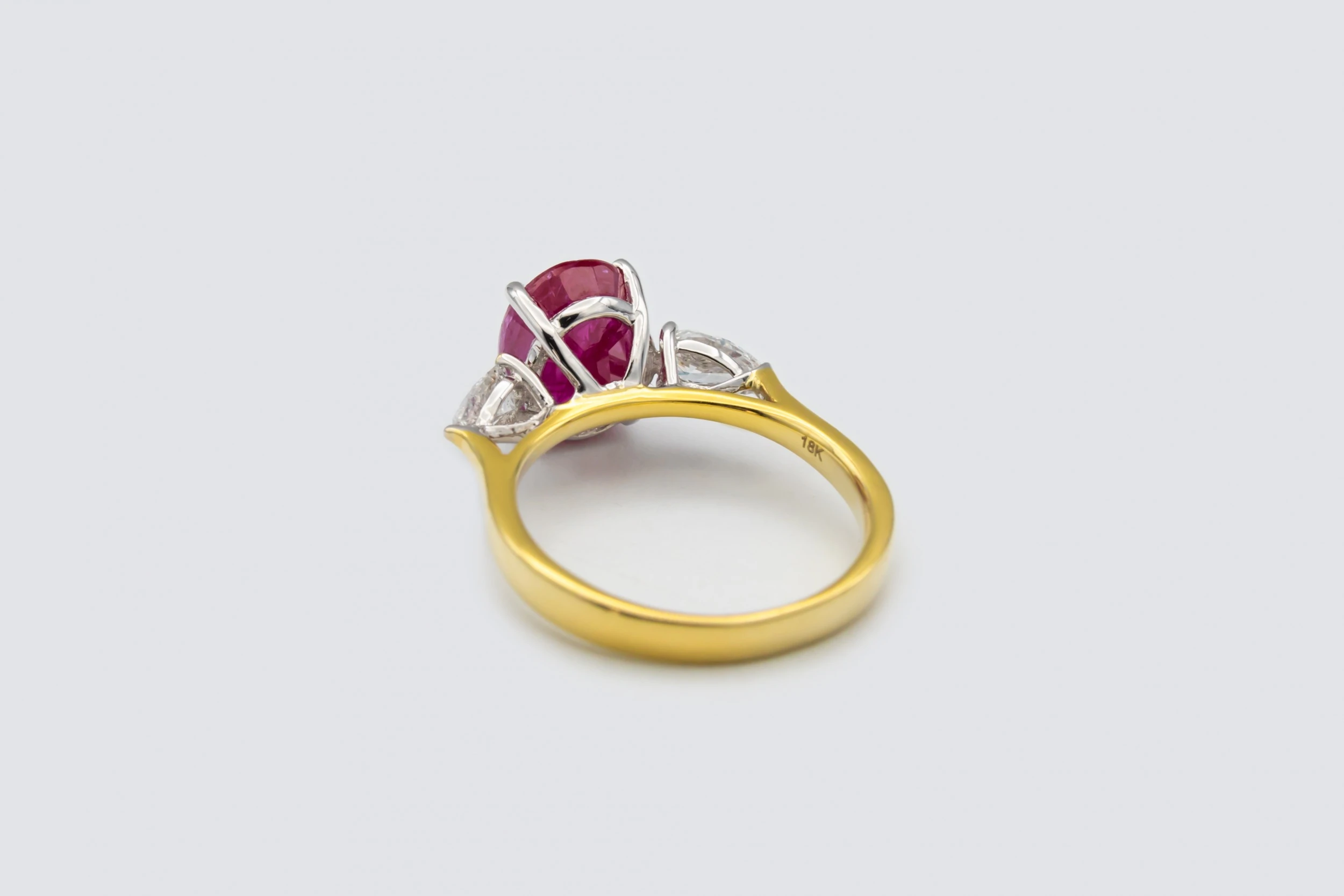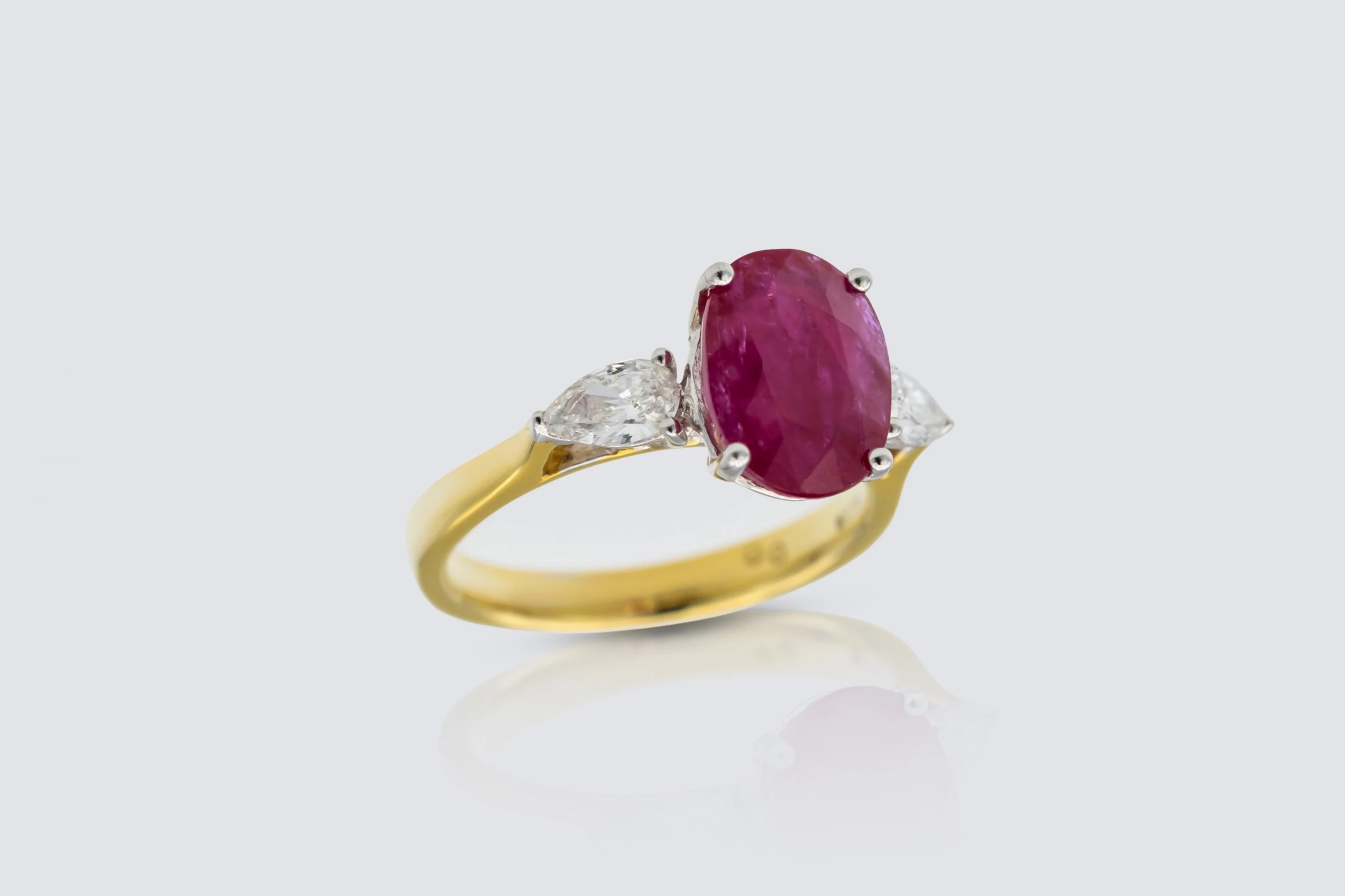 This Trilogy 3-Stone ring blends timeless sophistication with a bold modern aesthetic. At its centre lies a captivating natural ruby, glowing with deep, passionate red hues and perfectly balanced by two pear-cut natural diamonds that radiate brilliance from either side. Each gemstone is securely claw-set in luminous 18ct yellow gold, highlighting the vivid contrast between colour and clarity.